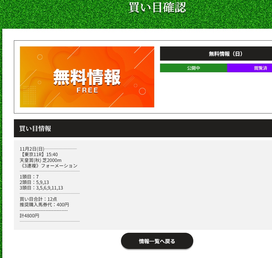 最近、100万近く当てたとか色々調子の良い感じの口コミが多かったので、試しに無料予想使ったら、天皇賞秋3連複的中して、15,280円利益出せました。土日の4鞍全部買ってトータルでもプラスになったし、これ、ほんとに調子いいんかもしれん。 画像クリックで拡大